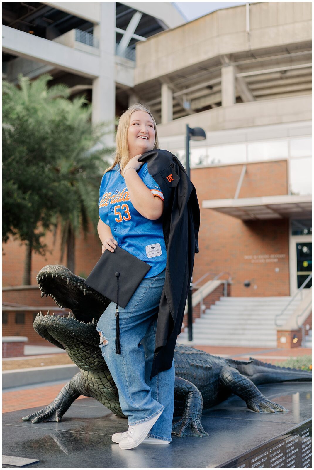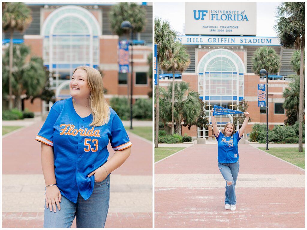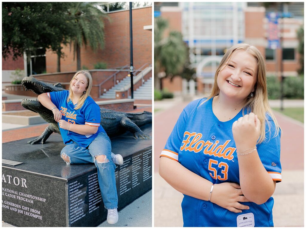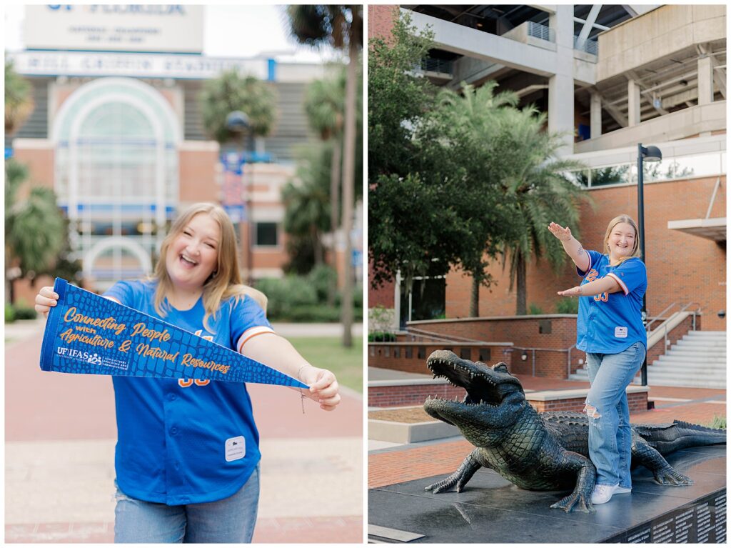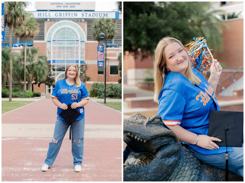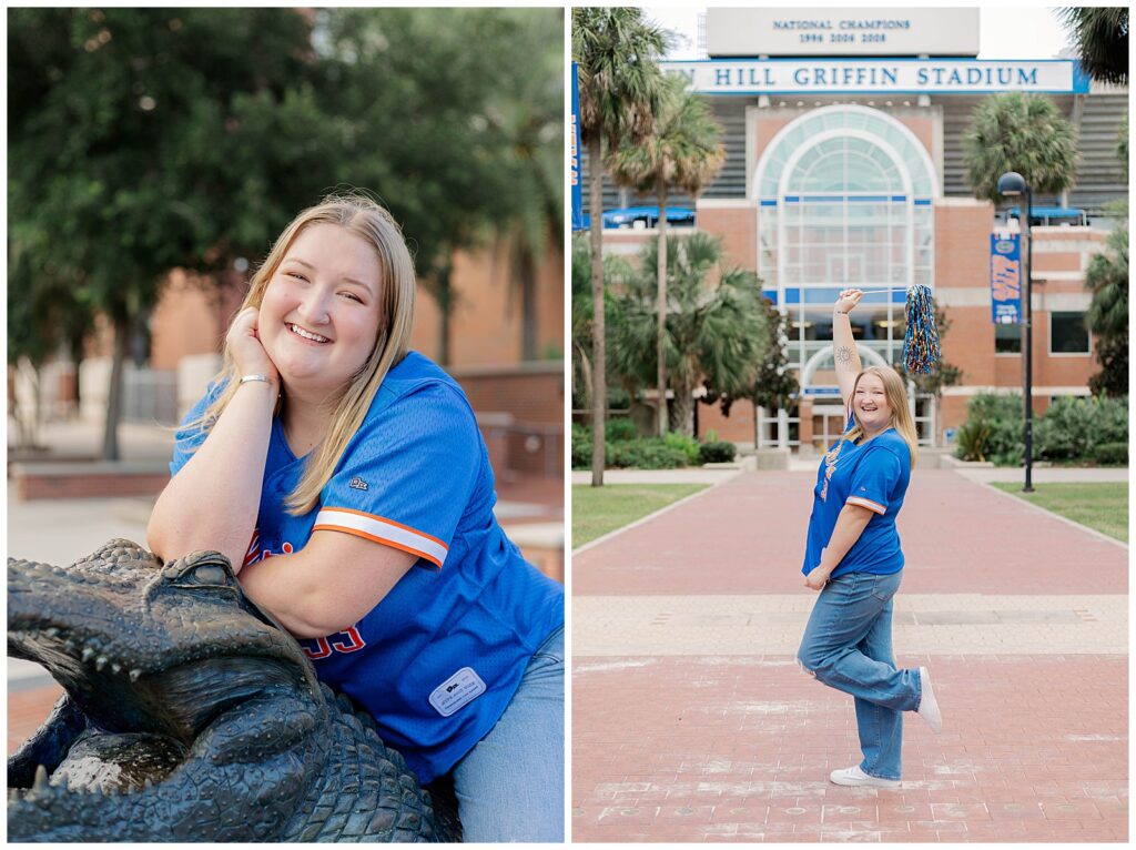 From Hill Griffin Stadium to the Gator statue, Caitlynne fully embraced her time at UF. Dressed in blue and orange and radiating confidence, she brought an energy to her session that felt effortless and genuine. She is truly full of Gator spirit, and it showed in every moment, from tossing pom-poms to laughing through candid, in-between frames.