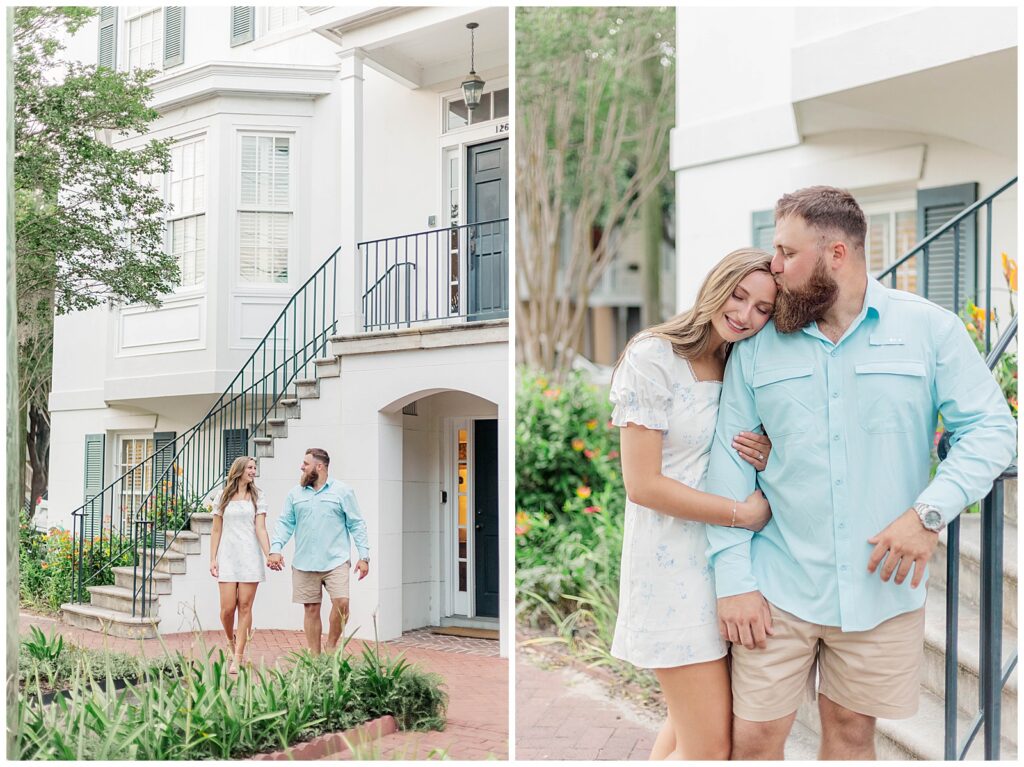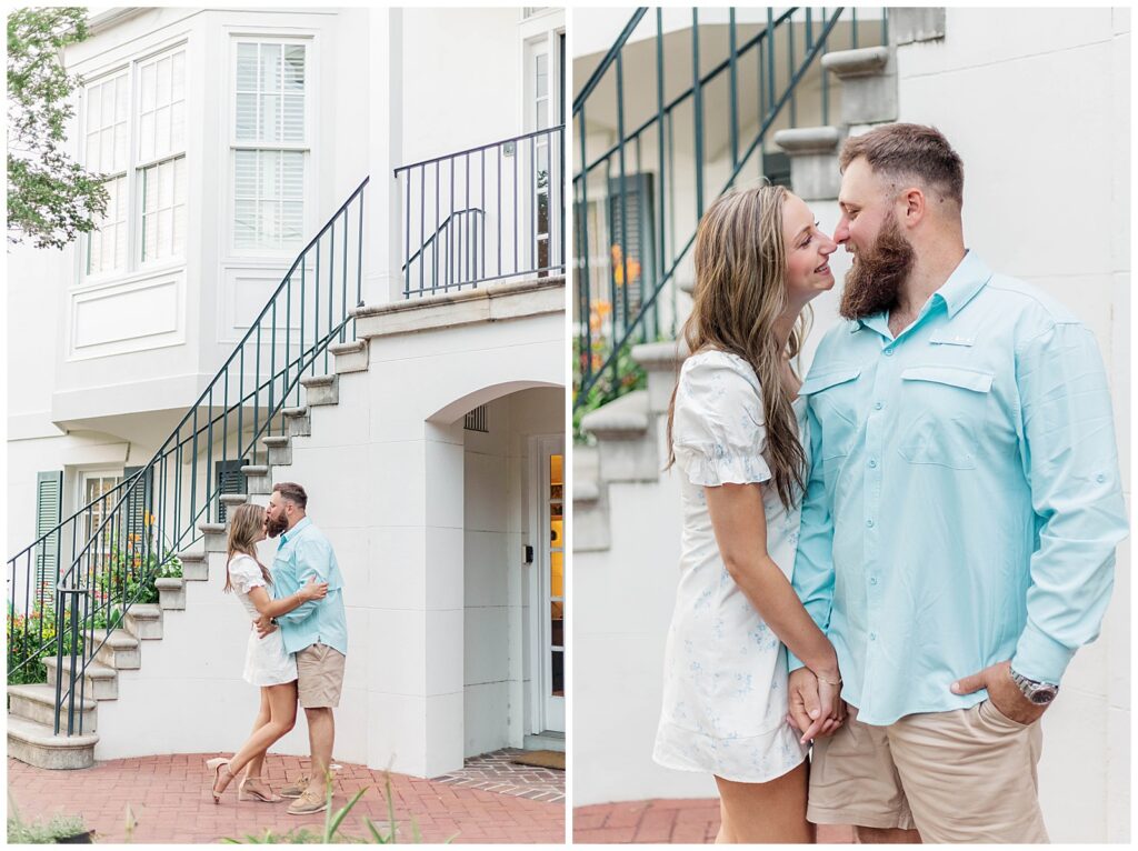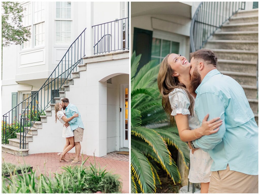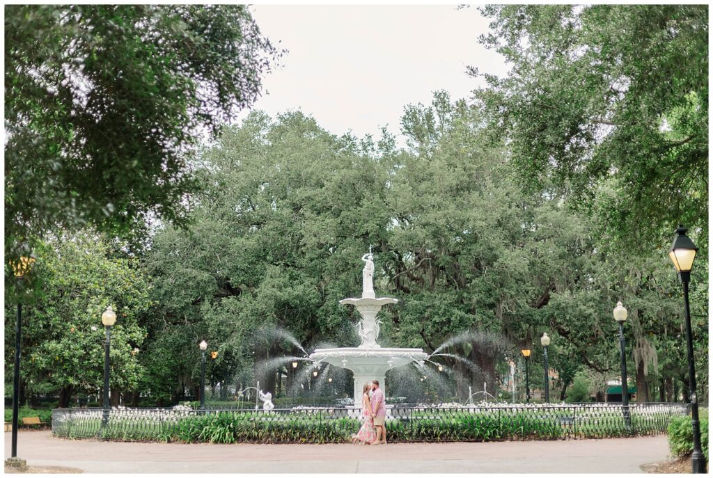 The moody light paired beautifully with Tayler’s fashionable yet understated outfit, while his more casual look complemented hers effortlessly. They moved through the park with ease. We wandered beneath the oak trees, along the fountain, and through the quiet streets she loved. Historic Savannah has a timeless charm that makes it one of the most romantic destinations in the South. Even with the earlier obstacles, we created images that felt refined, romantic, and true to them.